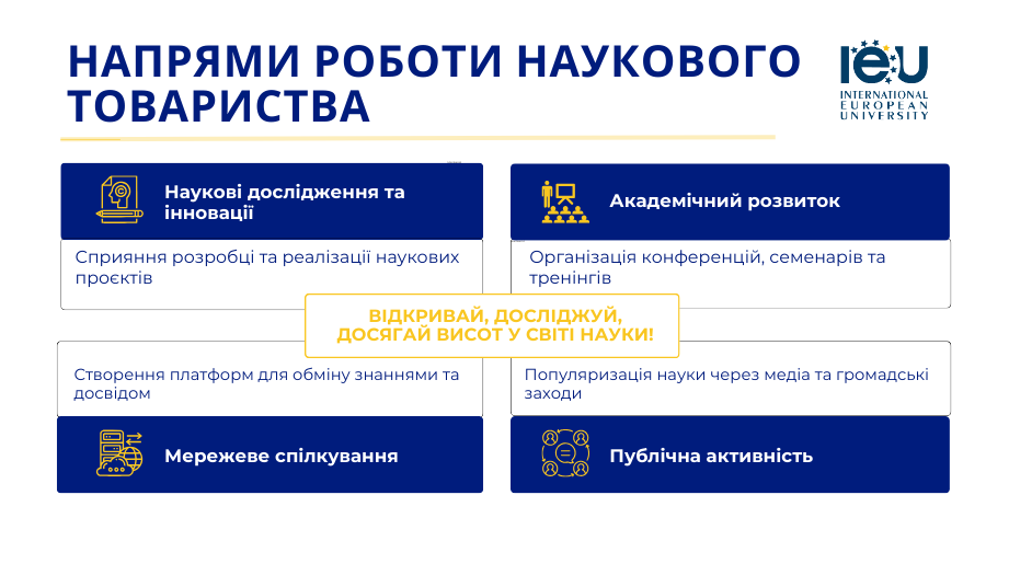 Наукове товариство нашого університету об’єднує студентів, аспірантів та молодих вчених у спільноту, яка прагне до інтелектуального зростання та наукових досягнень. Воно відіграє ключову роль у формуванні наукового потенціалу та підтримці інноваційного духу серед молоді.